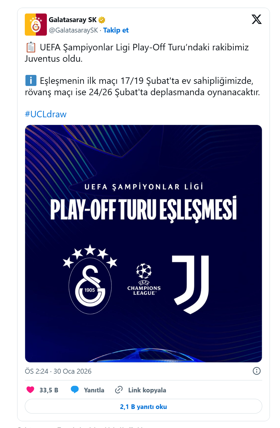 Galatasaray ile Juventus arasındaki ilk karşılaşma 17-18 Şubat 2026 tarihlerinde İstanbul’da oynanacak. Rövanş maçı ise 24-25 Şubat 2026’da İtalya’nın Torino kentinde gerçekleşecek. Eşleşmeyi geçen taraf, son 16 turunda Liverpool veya Tottenham’dan birisiyle karşılaşacak.