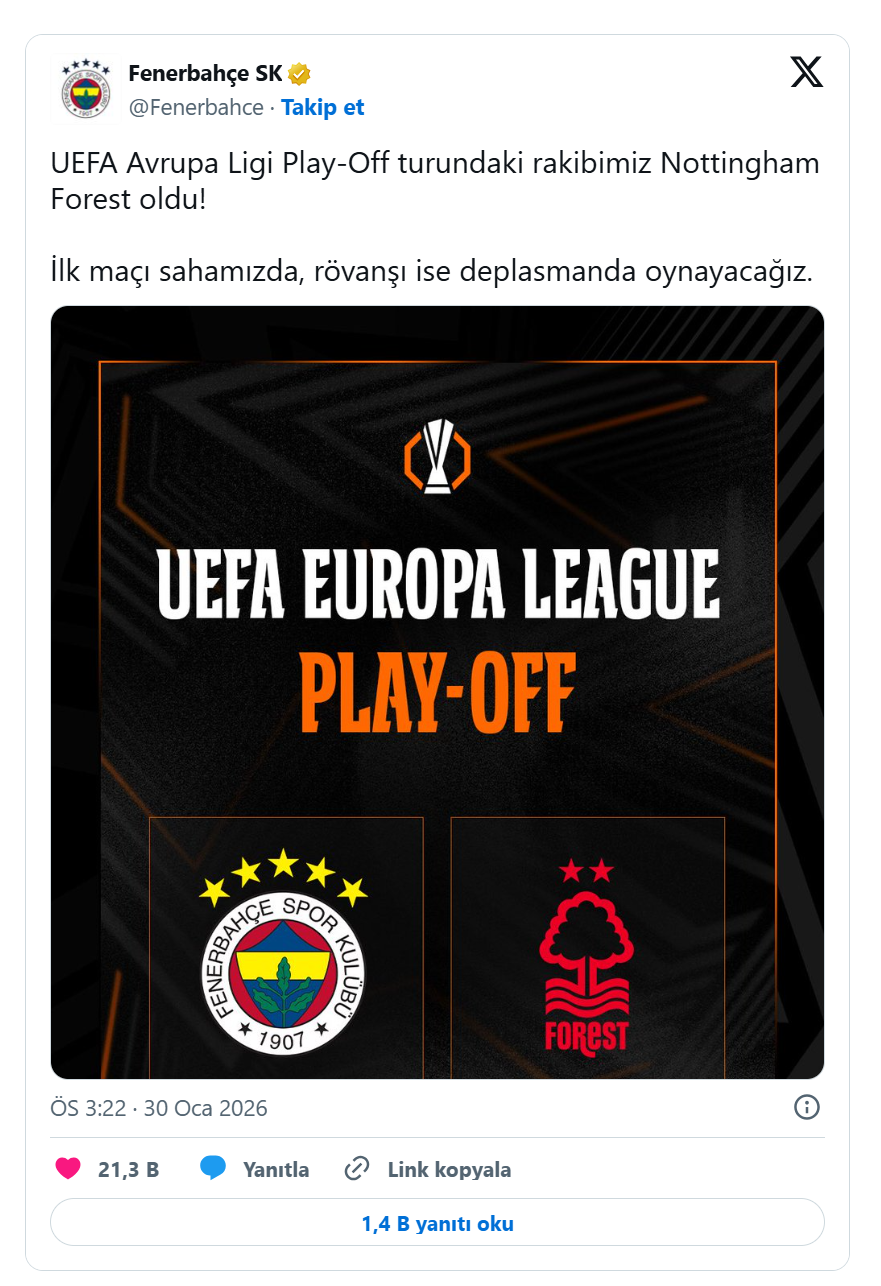 UEFA Avrupa Ligi’nde play-off turu kura çekimi bugün saat 15.00’te İsviçre’nin Nyon kentindeki UEFA Genel Merkezi’nde yapıldı. Lig etabını 12 puanla 19. sırada tamamlayan Fenerbahçe, son 16 turuna yükselmek için play-off turunda Nottingham Forest ile karşı karşıya gelecek.
