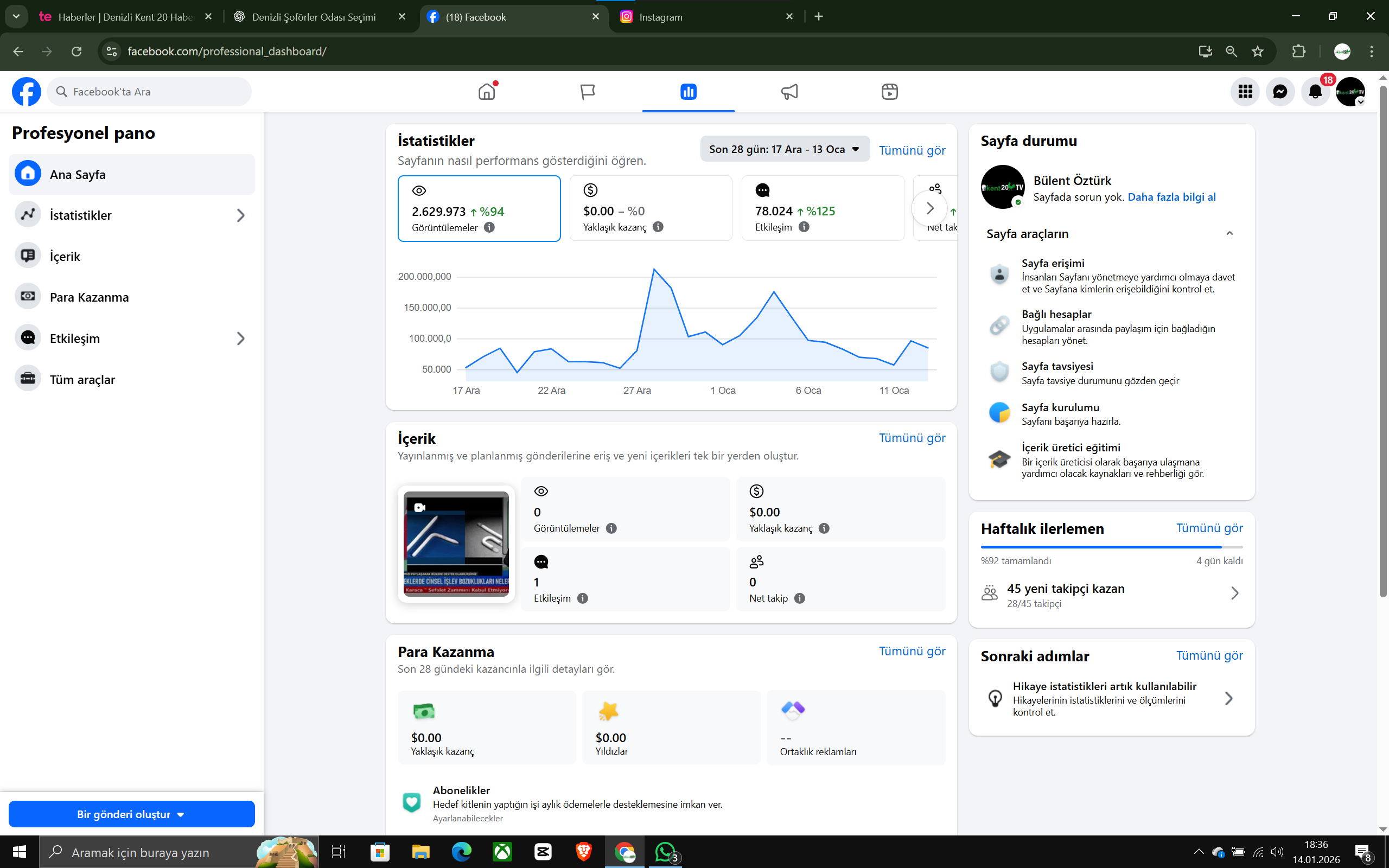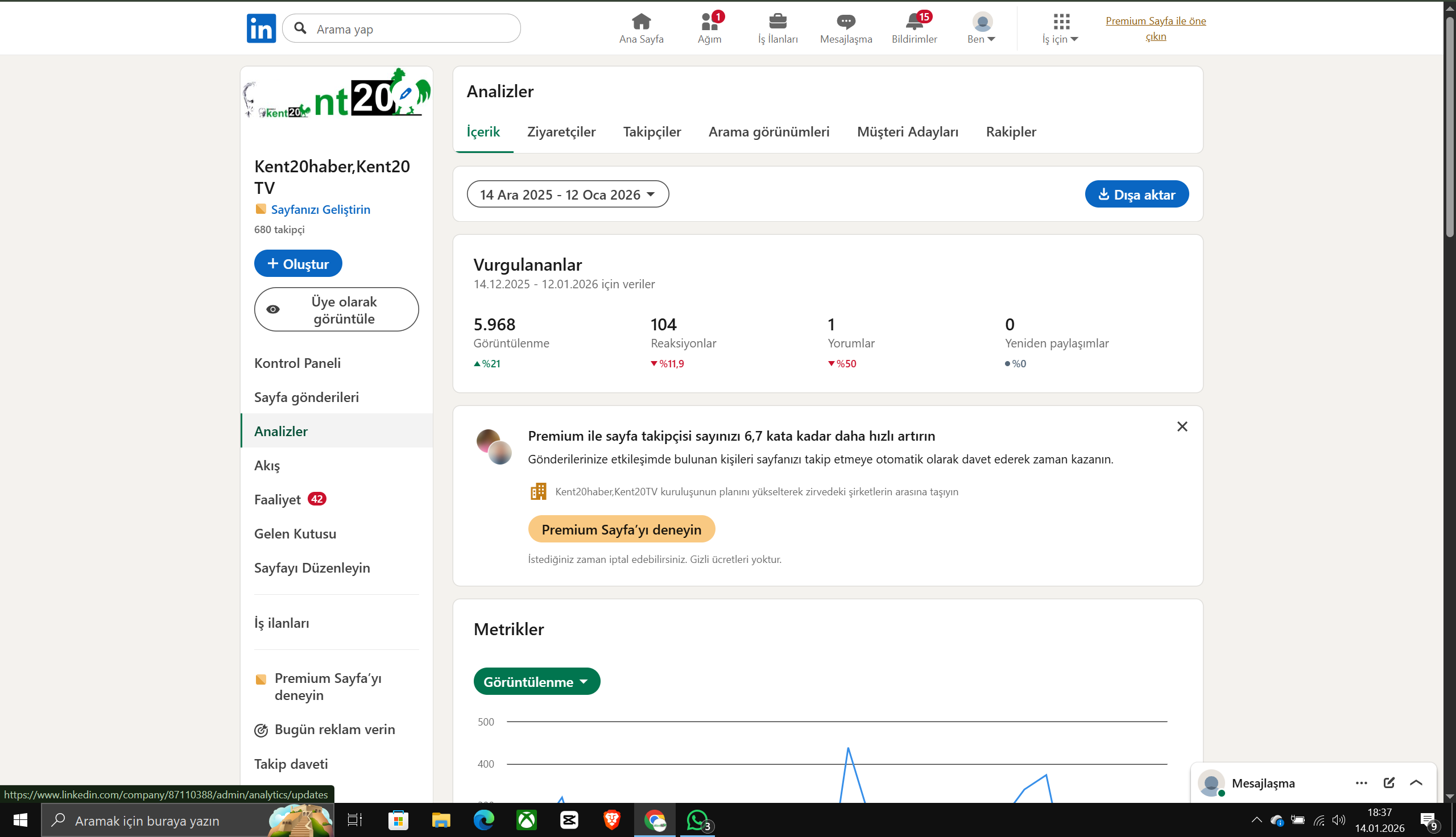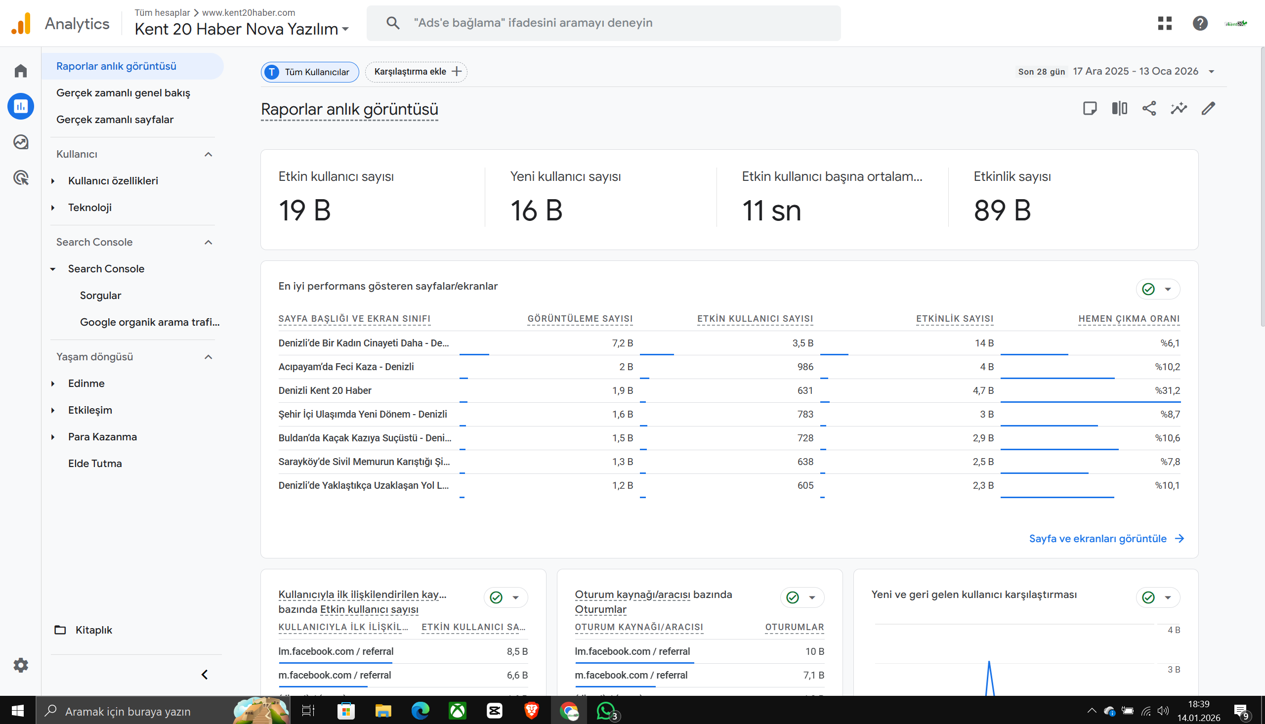 Kent20 TV ve Kent20 Haber, 14 Aralık 2025 – 14 Ocak 2026 tarihleri arasındaki son 1 aylık süreçte dijital mecralarda ulaştığı izlenme ve okunma rakamlarıyla dikkat çekti.
