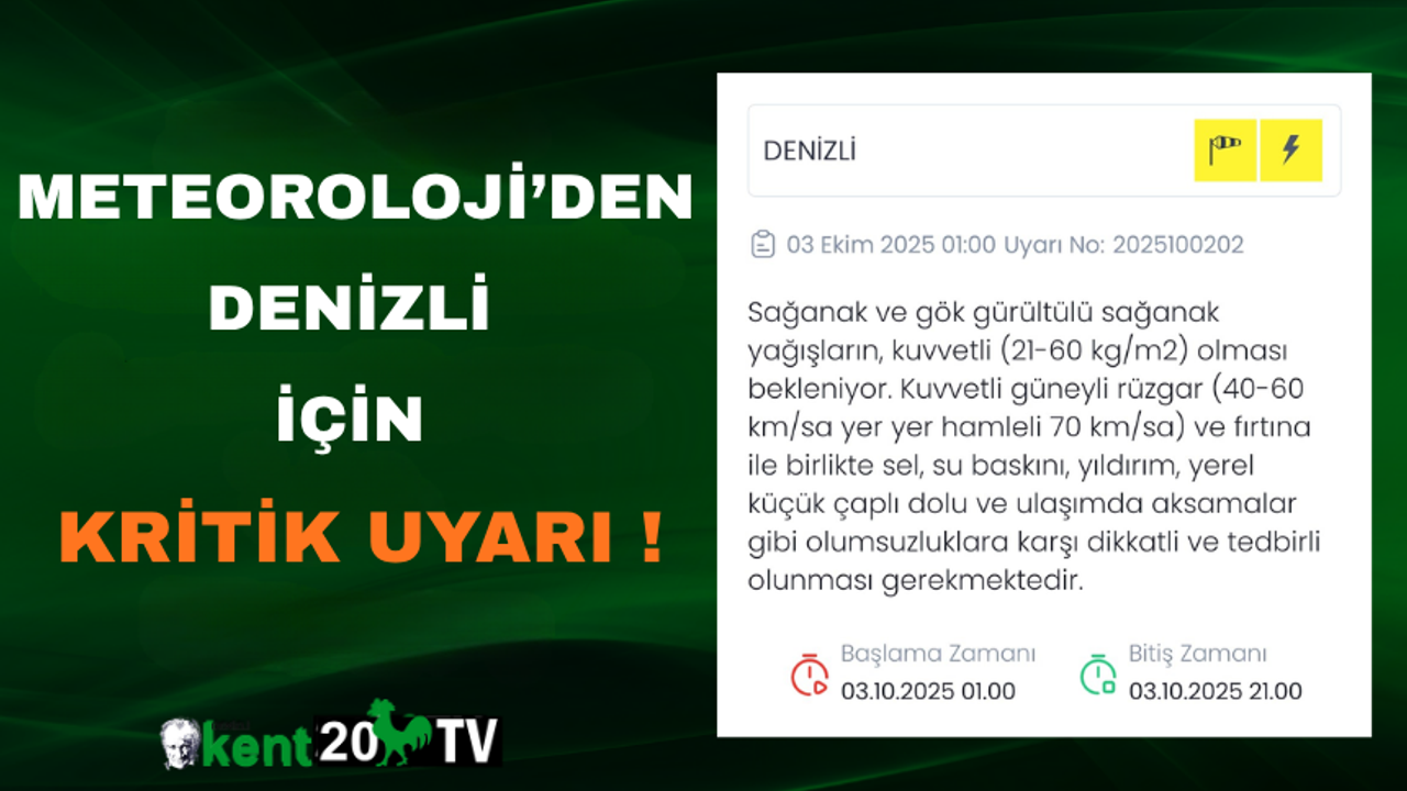 Meteoroloji Genel Müdürlüğü (MGM), Denizli için sarı kodlu uyarı yayımladı. Kent genelinde etkili olması beklenen sağanak ve gök gürültülü sağanak yağışlar ile birlikte kuvvetli fırtına uyarısında bulunuldu.