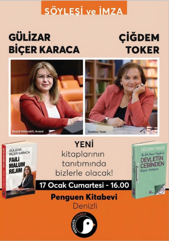 Denizli, 17 Ocak Cuma günü saat 16.00’da gazetecilik ve siyasetin kesiştiği önemli bir etkinliğe ev sahipliği yapacak. Denizlili siyasetçi-hukukçu-yazar Gülizar Biçer Karaca ile gazeteci-yazar Çiğdem Toker, yeni kitaplarının tanıtımı kapsamında Penguen Kitabevi’nde okurlarla buluşacak.