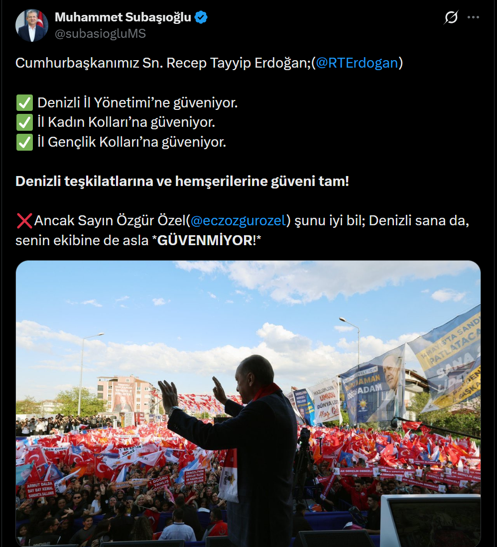 Paylaşımında CHP Genel Başkanı Özgür Özel’e doğrudan seslenen Subaşıoğlu, “Ancak Sayın Özgür Özel şunu iyi bilmelidir ki; Denizli sana da, senin ekibine de asla güvenmiyor” ifadelerini kullandı. Bu sözler, siyasi kulislerde ve sosyal medyada geniş yankı uyandırdı.